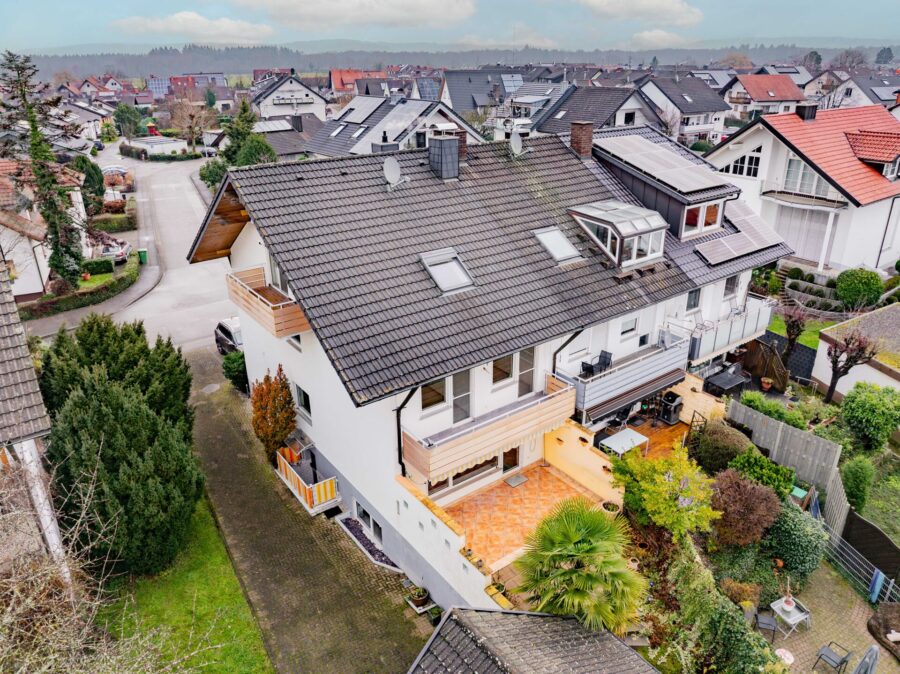 Der Balkon im 1. Obergeschoss ist zudem gleich von zwei Schlafzimmern aus zugänglich und bietet einen angenehmen Blick in den Garten. Eine gepflegte Terrasse, elektrische Markisen an allen Balkonen sowie moderne Dachfenster mit elektrischen Rollläden sorgen für zusätzlichen Wohnkomfort.