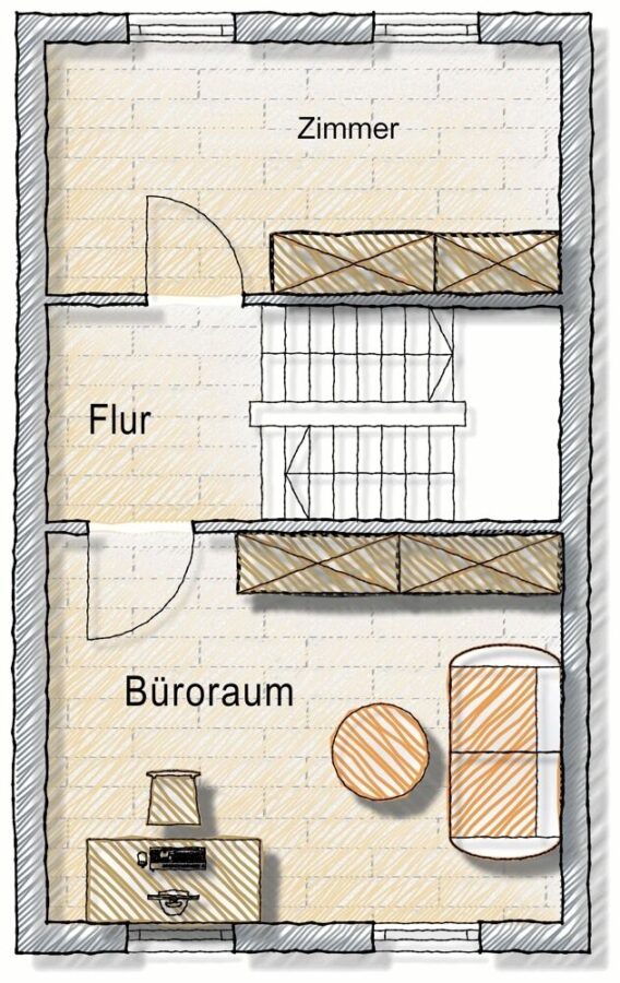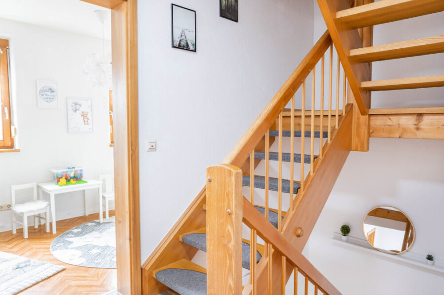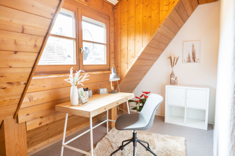 Im 1. Obergeschoss befindet sich das Wohnzimmer mit ca. 13m² und ein Schlafzimmer. Das Dachgeschoss ist in zwei Räume aufgeteilt. Das größere Zimmer kann als Schlafzimmer genutzt werden und das andere Zimmer eignet sich gut als Büro oder begehbarer Kleiderschrank.