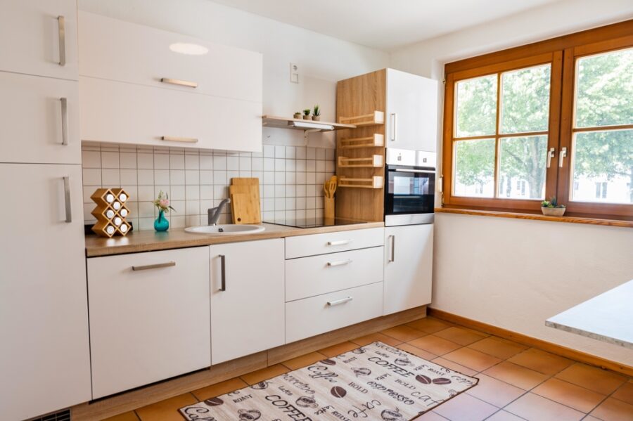 Die Küche ist mit einer modernen Einbauküche inkl. Elektrogeräte und einem Essbereich ausgestattet. Das Badezimmer, sowie das WC verfügen über weiße Fliesen und jeweils ein Fenster.