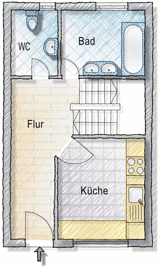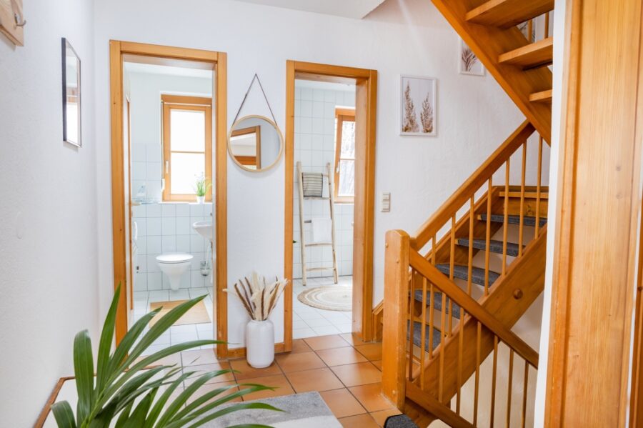 Im Erdgeschoss befindet sich der Flur mit Eingangsbereich, die Küche, ein sperates WC und Badezimmer.