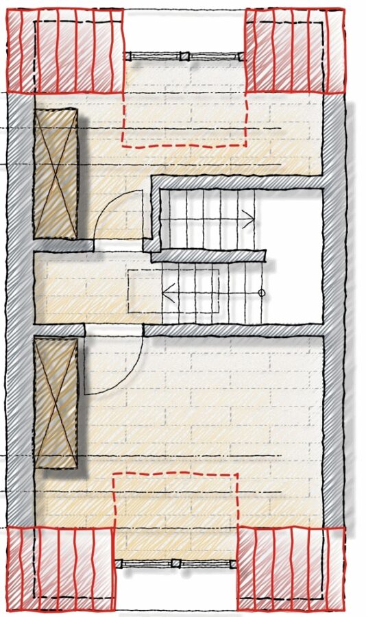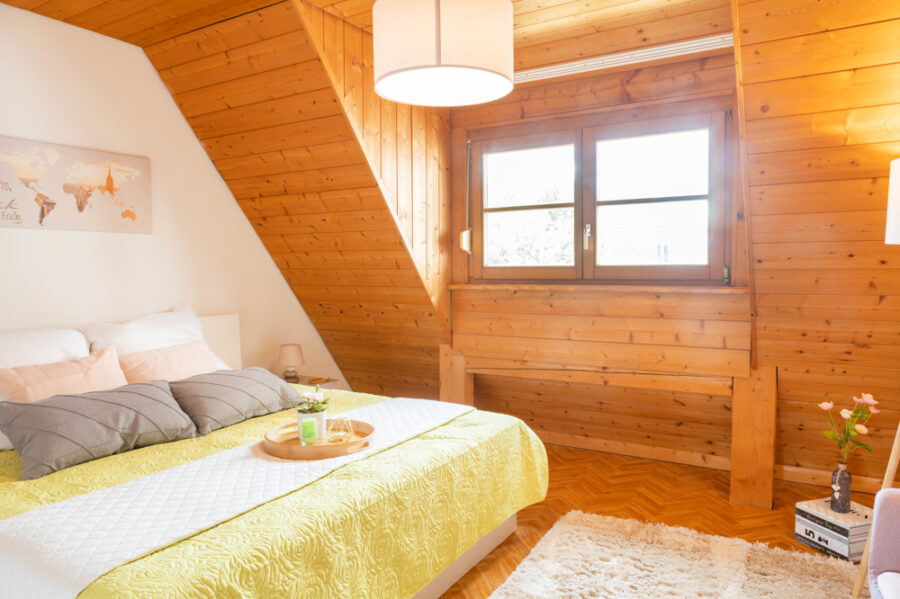 Im 1. Obergeschoss befindet sich das Wohnzimmer mit ca. 13m² und ein Schlafzimmer. Das Dachgeschoss ist in zwei Räume aufgeteilt. Das größere Zimmer kann als Schlafzimmer genutzt werden und das andere Zimmer eignet sich gut als Büro oder begehbarer Kleiderschrank.